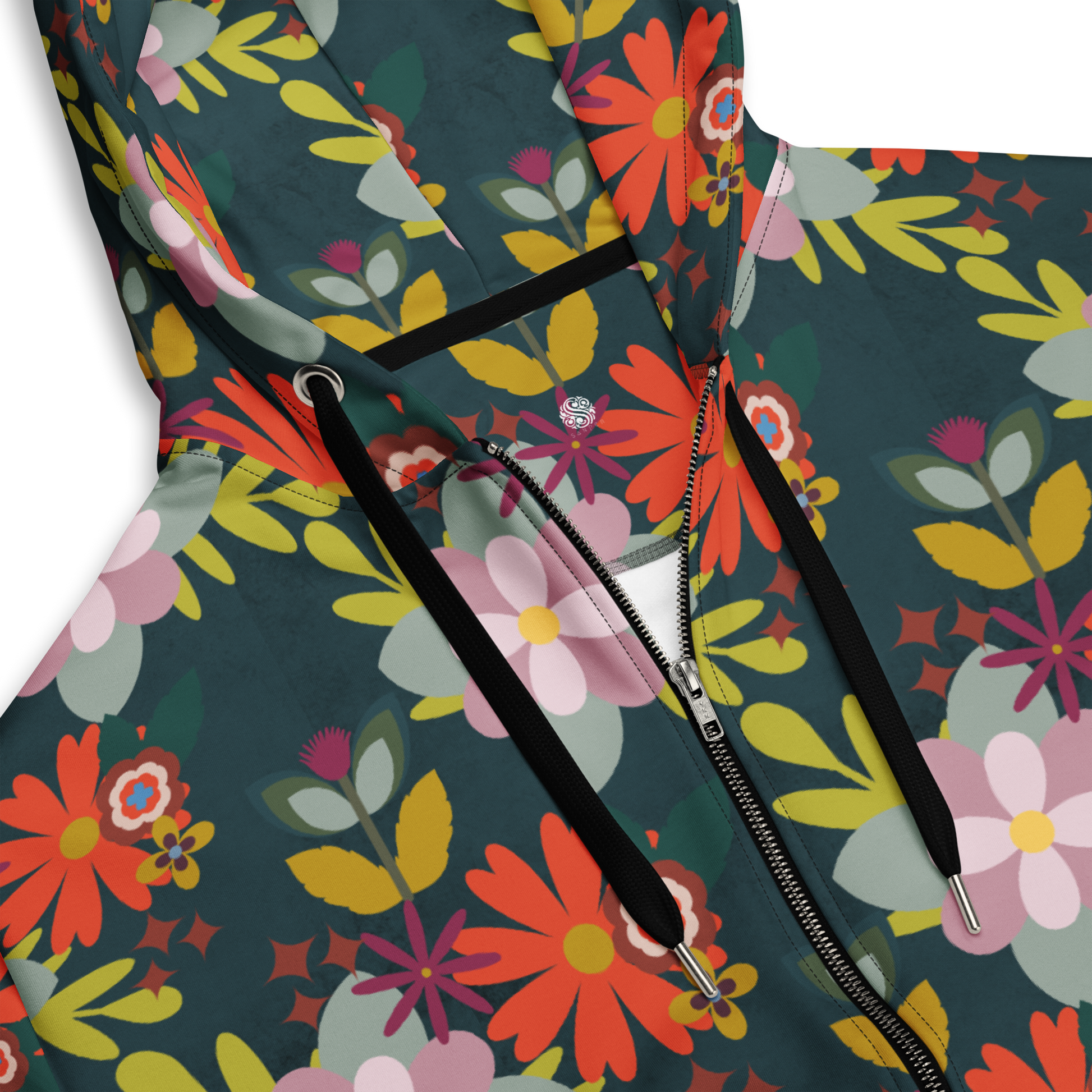 - This hoodie has a central front zipper. Design alignment on the two front panels cannot be guaranteed due to garment structure.
